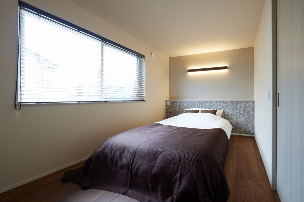 間接照明、窓、クロスのバランスによって、シンプルながらも落ち着きのある寝室を演出。
